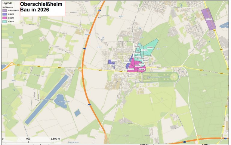 Der Glasfaser-Ausbau im Ort Oberschleißheim ist derzeit in vollem Gange. Zum Jahresende wird der Ausbau in Oberschleißheim zu 60% vollzogen sein. In der beigefügten Karte sind die für den Ausbau in 2026 verbleibenden Gemeindegebiete ersichtlich.